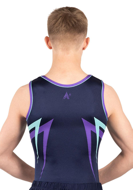 Navy sleeveless leotard with aqua and purple details