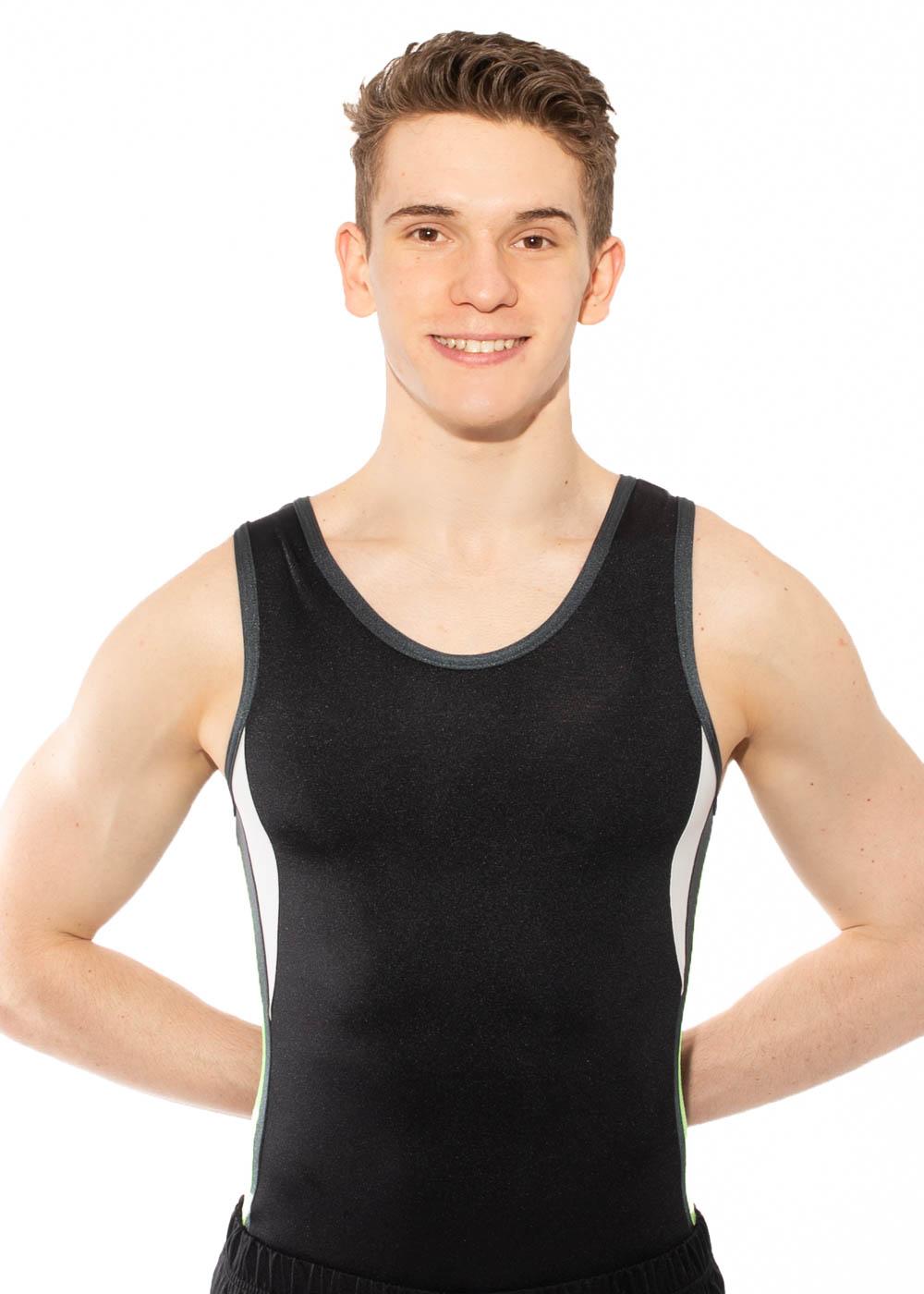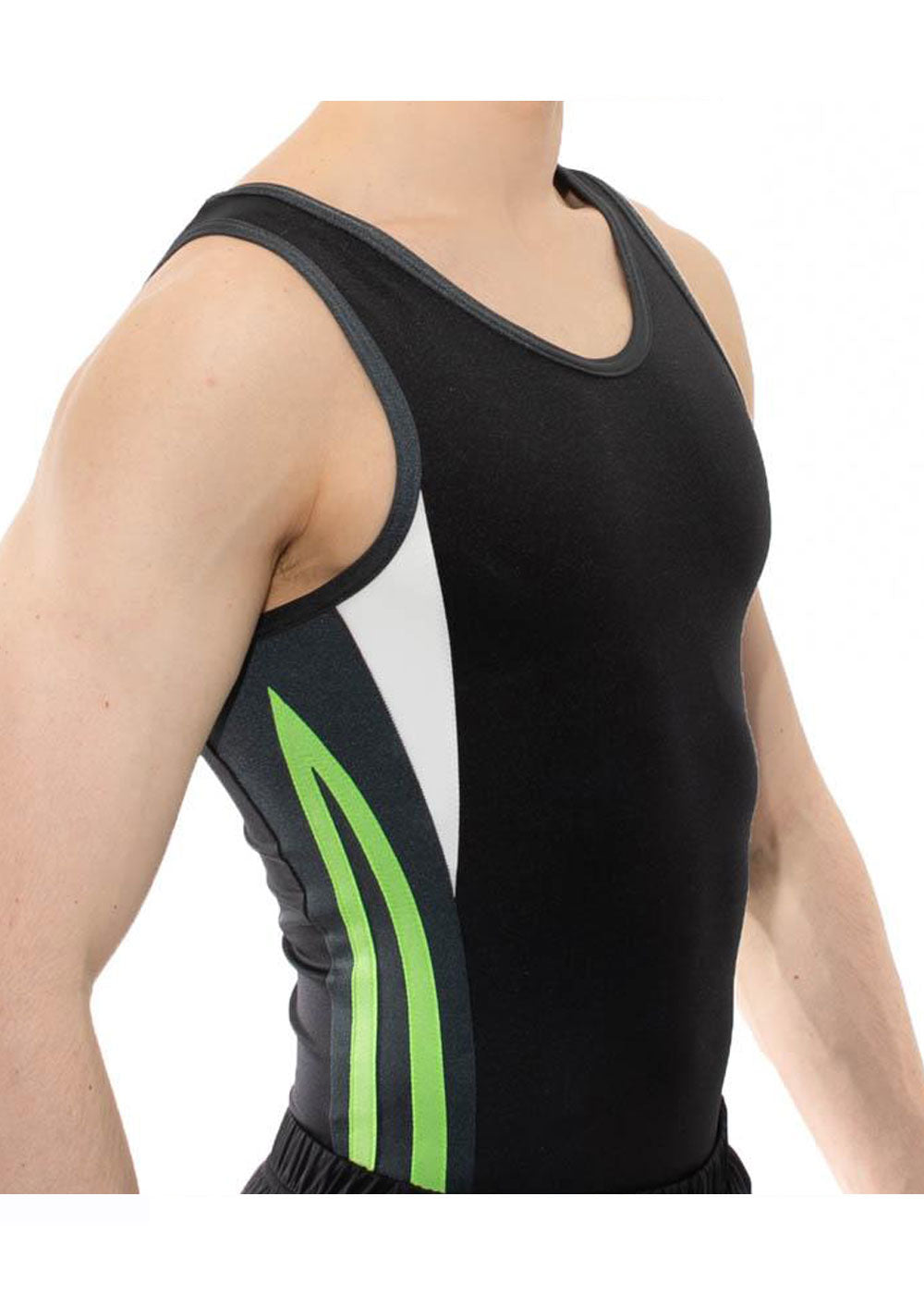 Designed for maximum performance, this black body with grey side panels and vibrant white and florescent green accents gives you a bold, athletic look. Perfect for trampolining or gymnastics, the striking side details are made to stand out while keeping you comfortable and flexible.